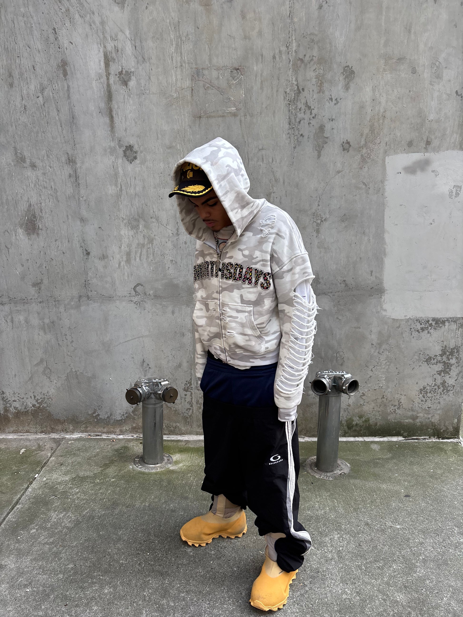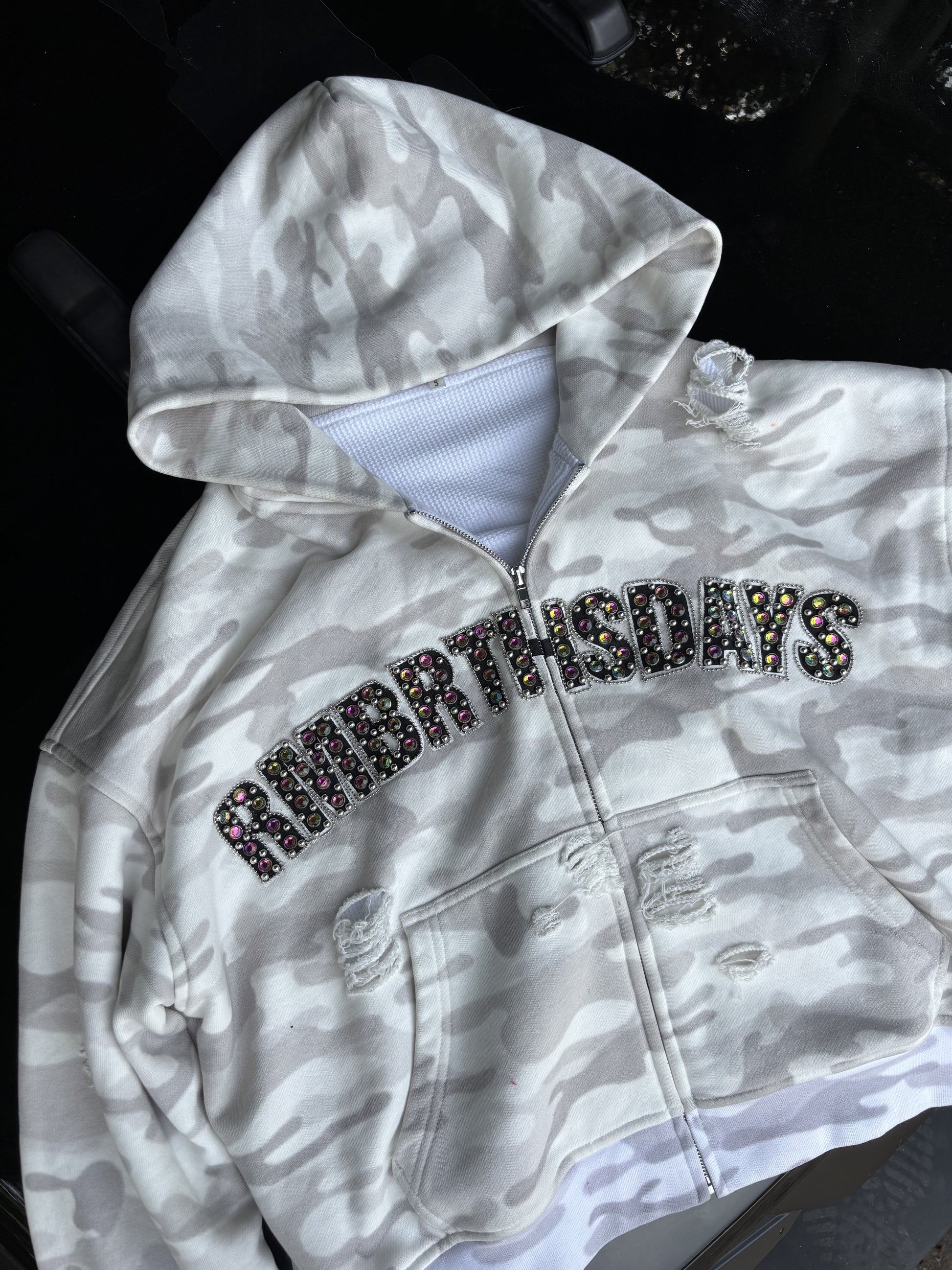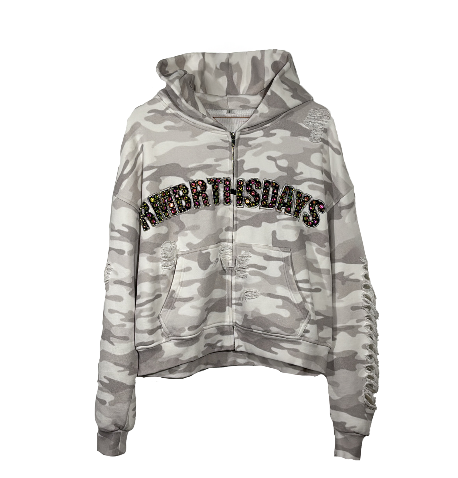 Details: Distressed sleeves, rhinestone lettering, drop-shoulder zip-up